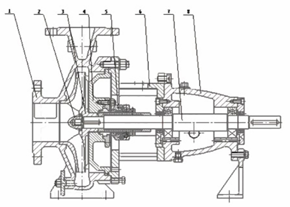 (1)泵(beng)體;(2)葉(ye)輪螺(luo)母;(3)葉(ye)輪件(jian);(4)泵蓋(gai);(5)密封(feng)部件(jian);(6)中間(jian)支架(jia);(7)軸;(8)懸(xuan)🛀🏼架部(bu)件